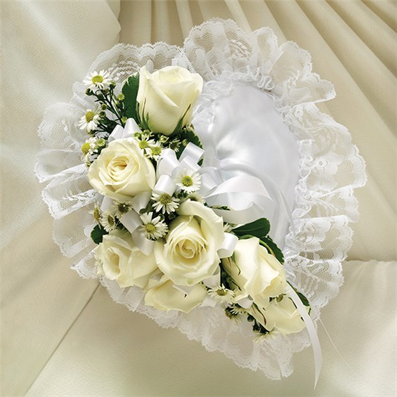 •Heart-shaped satin casket pillow is adorned with a spray of white roses, baby’s breath, ribbon and soft, lush greenery